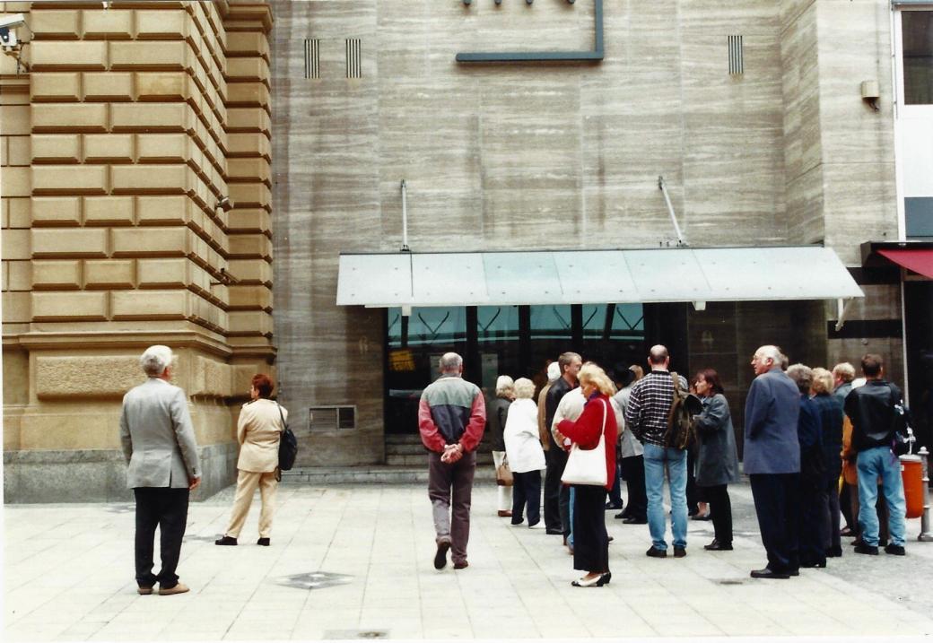 Nun kommen wir wieder zu unseren Pannen. Ein Vortrag über Anlagenstrategien fiel mangels eines Referenten der Börse aus. Diese beteiligte sich an einen Unfall und war damit verhindert. Eine Stunde zog ins Land, eine Ersatzperson konnte kurzfristig nicht besorgt werden. Wiederum erhitzten sich die Gemüter, es wurde zeitweise ein Liedchen angestimmt. Das Ende vom Lied war, es wurde eine Unterschriftenliste aufgesetzt mit dem Ziel der späteren Beschwerde beim Veranstalter. Jetzt rollte eine Welle der Entschuldigungen seitens der Bank und der Reiseleitung über uns hinweg. Das Ergebnis, wir verließen die Deutsche Bank ohne einen Vortrag der Börse.